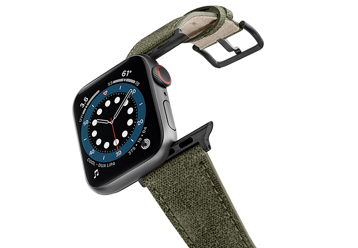 The perfect army green band, the Recycled Green is made from recycled cotton fabrics repurposed into a colourful and compatible companion for Series 8 & SE and, all previous versions. The high-quality canvas look has been treated with performance wax for durability. The band features a double loop strap design and is available in multiple hardware colours. Compatible with AW case size 38/40/41 mm