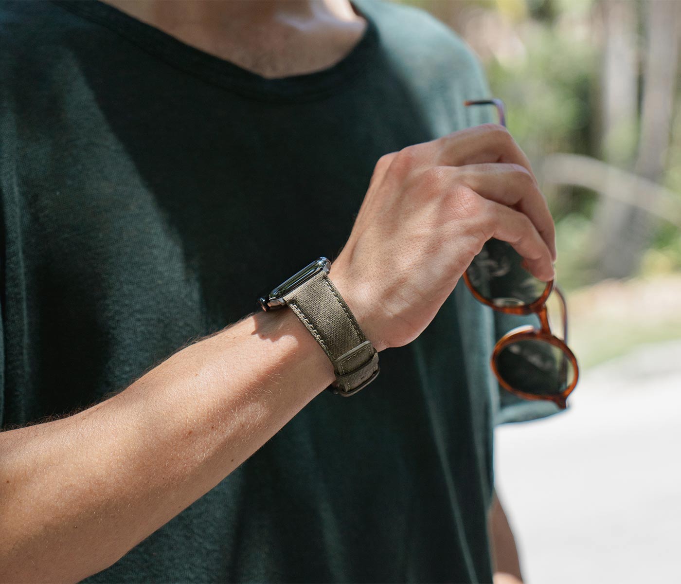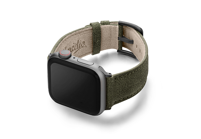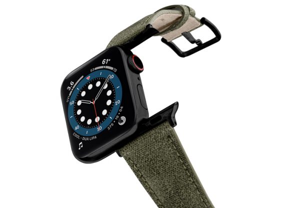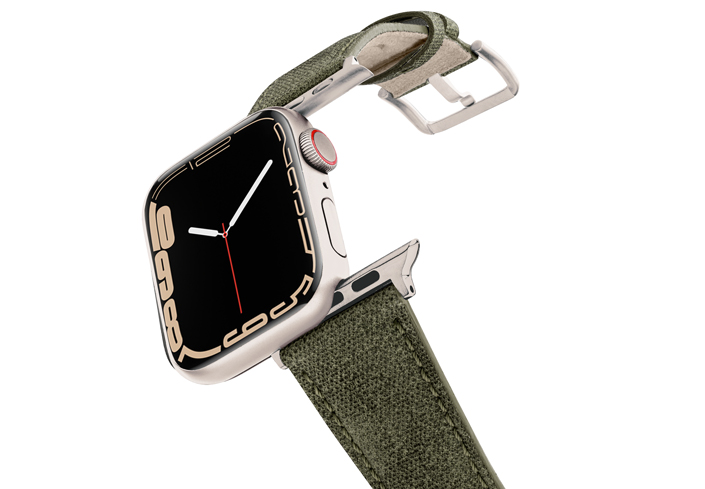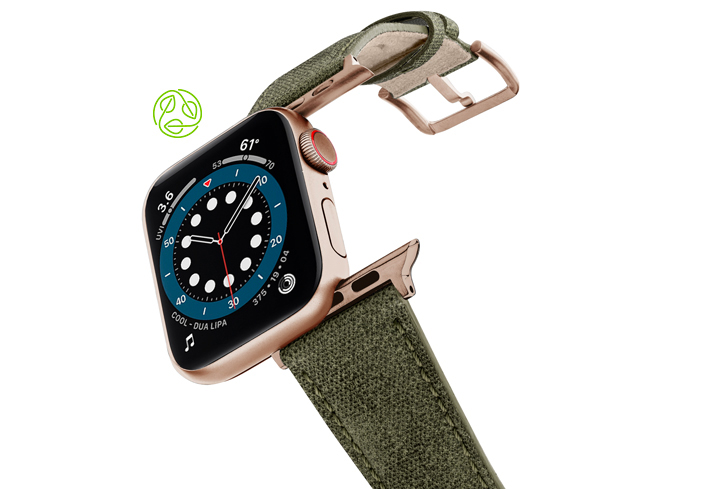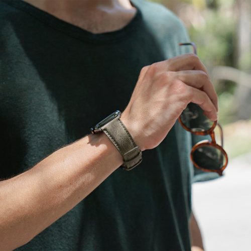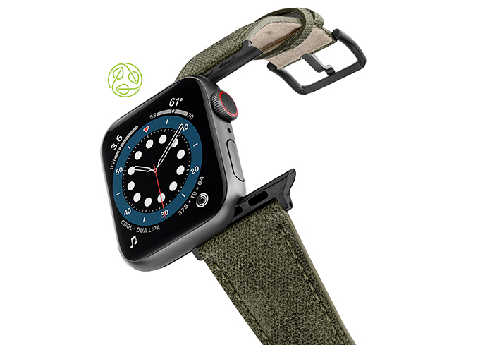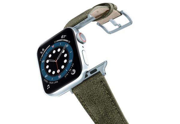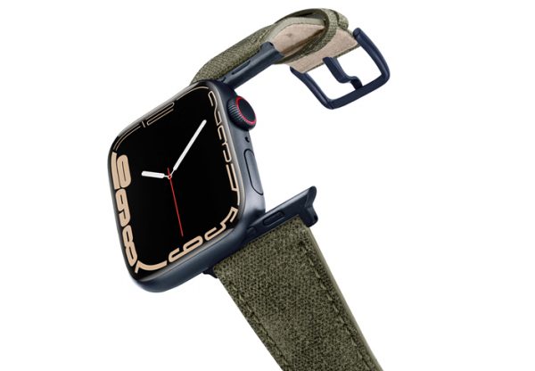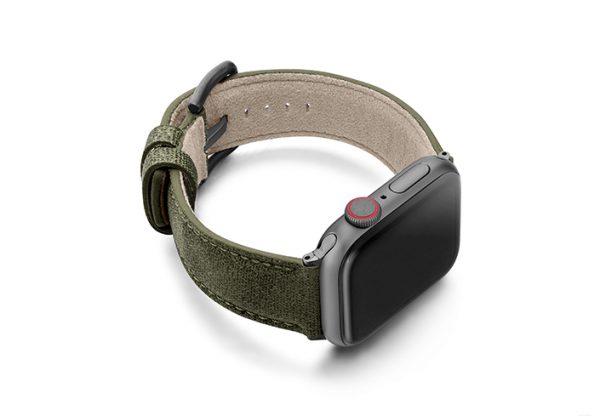 Il cinturino ha un colore verde militare perfetto per la uaglio’ primavera/estate. E’ realizzato con tessuti di cotone riciclato, compatibile per le serie 8, SE e versioni precedenti. La tela di alta qualità è stata trattata con cera ad alte prestazioni per conferire al prodotto una maggiore durata e comfort. Presenta un design con doppio passante ed è disponibile per casse di  AW 38/40/41