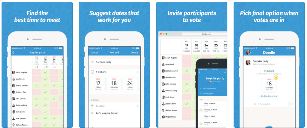 With Doodle you can find the best time for any event inviting participants to select their preferences, and they don’t even need to install the app or to have an account to do that.