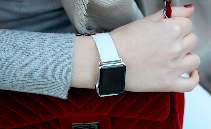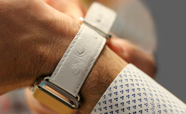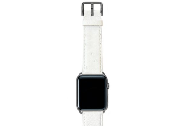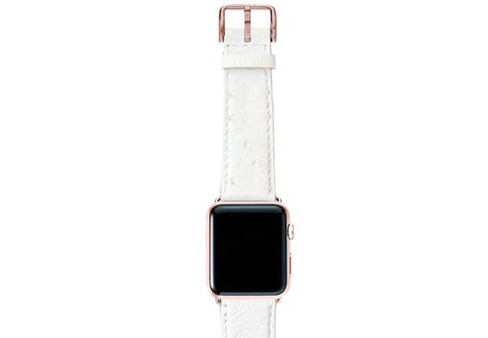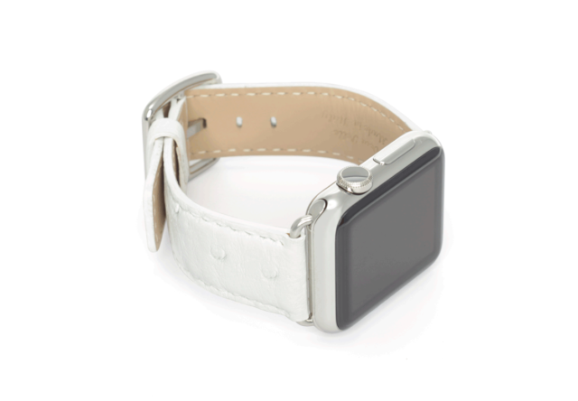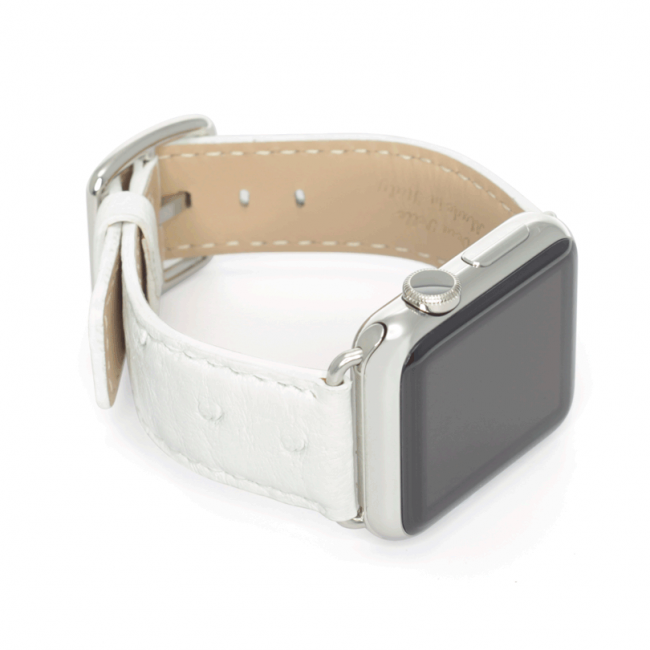 Snow Flake, il cinturino in pelle di struzzo made in Italy, è candido e morbido, perfetto per l’Apple Watch Series 4 e  3 | 2 | 1 di una donna di classe. Disponibile per 42-44 mm
