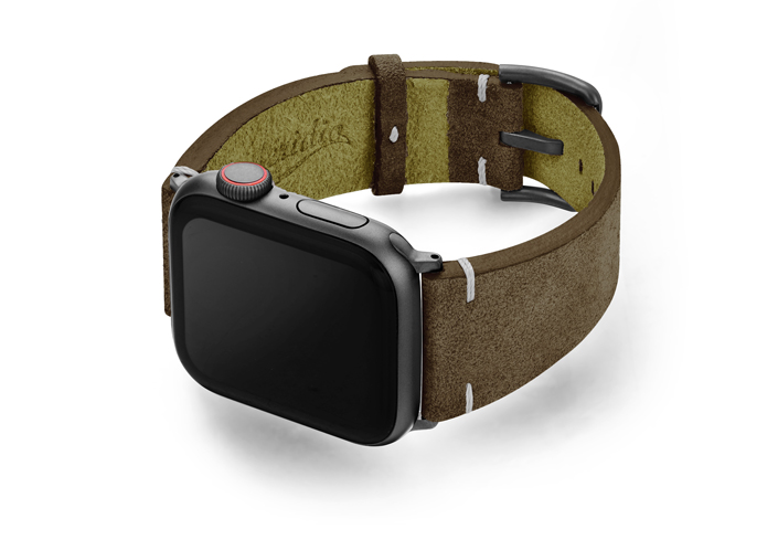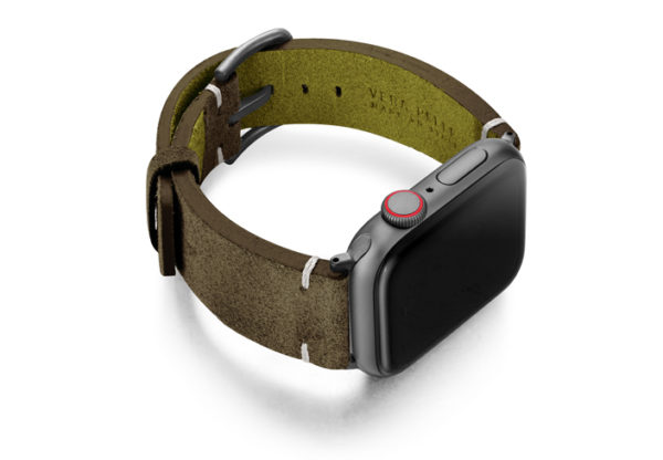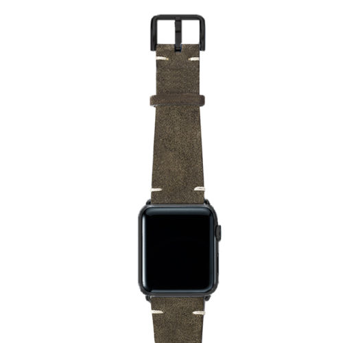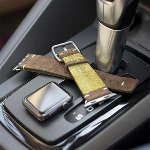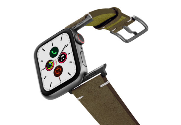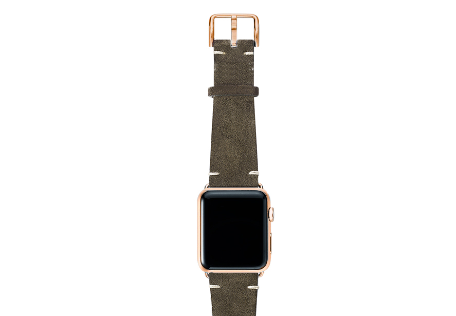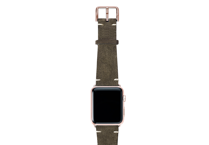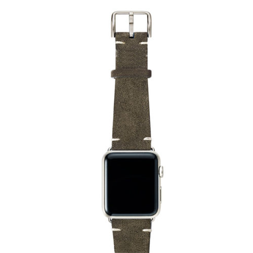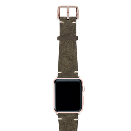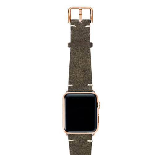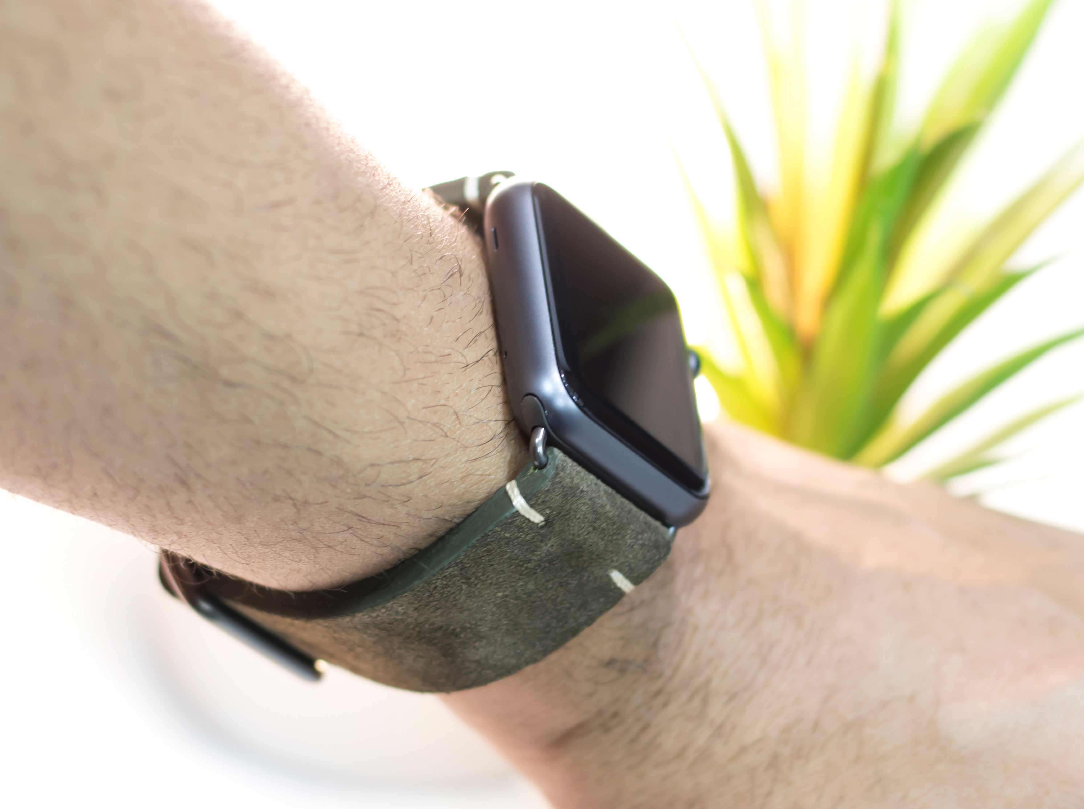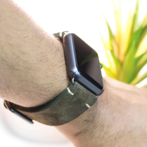 Cinturino verde scamosciato per Apple watch 100% Made in Italy. Le tonalità di colore presenti nel cinturino evocano grandi distese di campi, trasmettendo un senso di pacifica libertà. Compatibile con Apple watch series 6 & SE e 5|4|3|2|1.  Solo per casse 42-44 mm